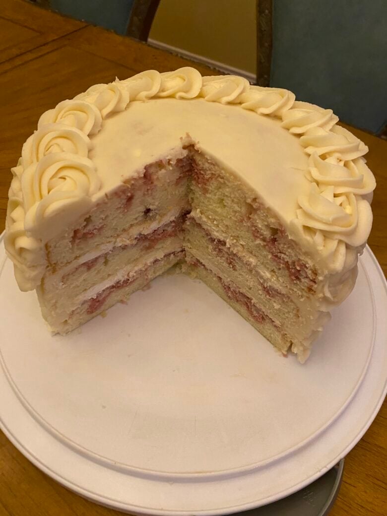 This is the best homemade white cake I have ever made! And I have tried SO many! It's moist with a light crumb and the raspberry and almond make it super delish! I've made it twice as a bunny cake for Easter and he was devoured both times!