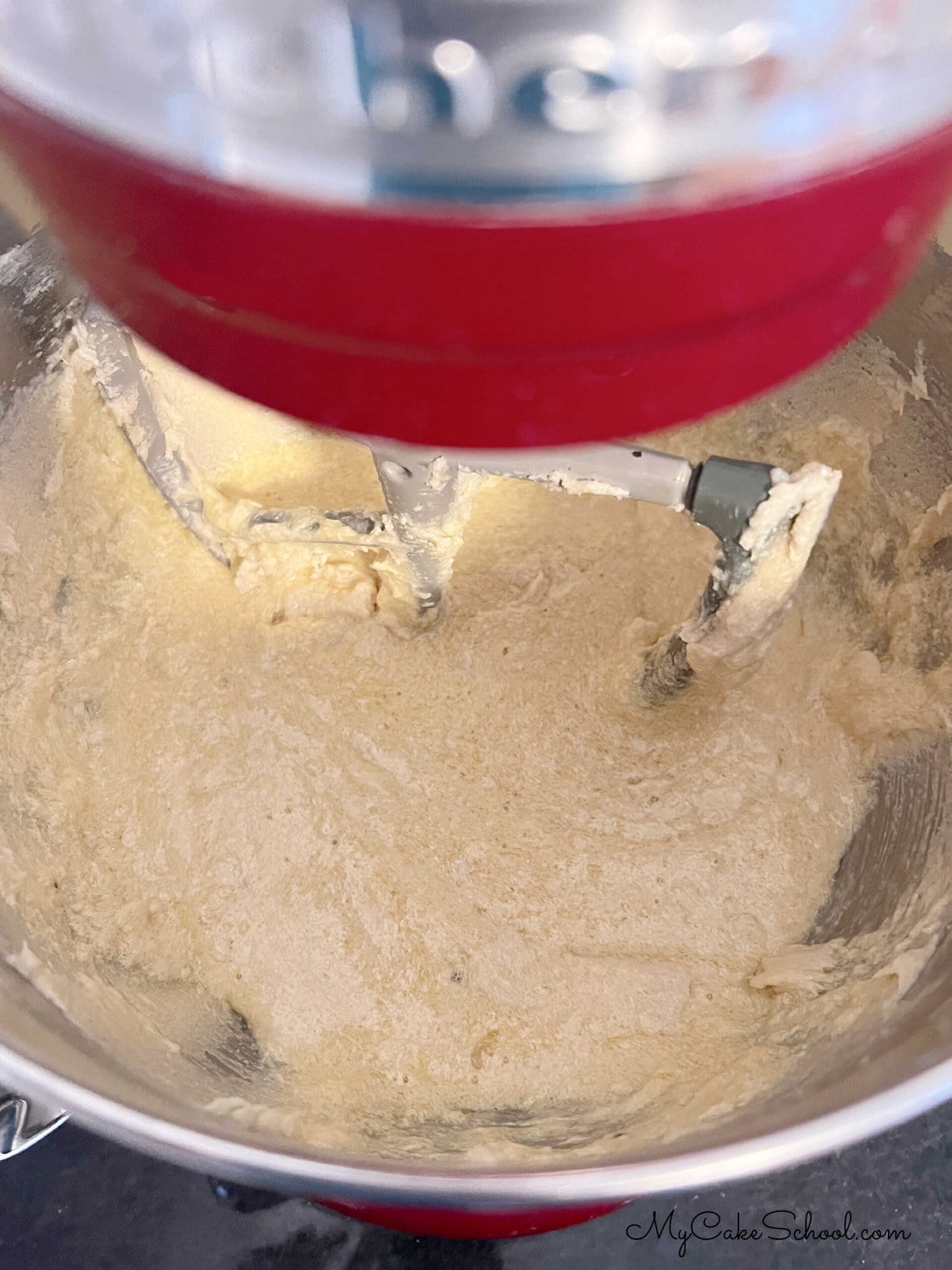- With the mixer on low speed, add the flour mixture alternately with the Banana Mixture to the butter, sugar, & egg mixture. Begin and end with the dry ingredients. I add the dry 3 times and banana mixture twice.