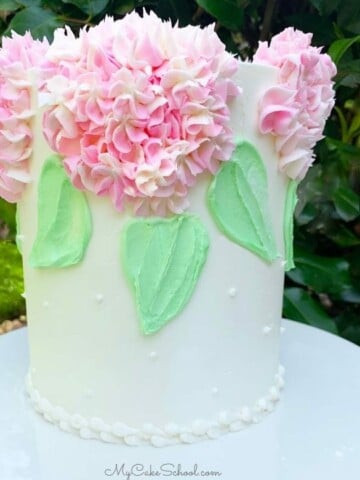 For this video, I used a six inch double barrel cake (which stood about 7 inches tall). Of course, you can pipe hydrangeas on cakes of any shape or size!