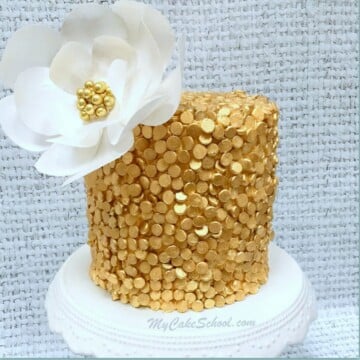 This is my first frozen buttercream transfer wrap, where a piped design was created on acetate, wrapped around the cake, and frozen. It is such a fun technique!