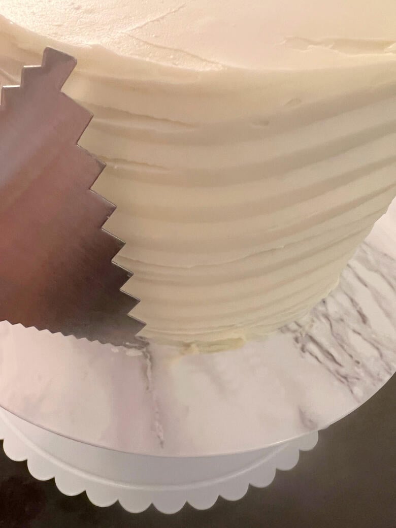 - Decorate the cake however you like! We frosted the chilled cake with a second layer of frosting, and then used a cake comb around the sides.