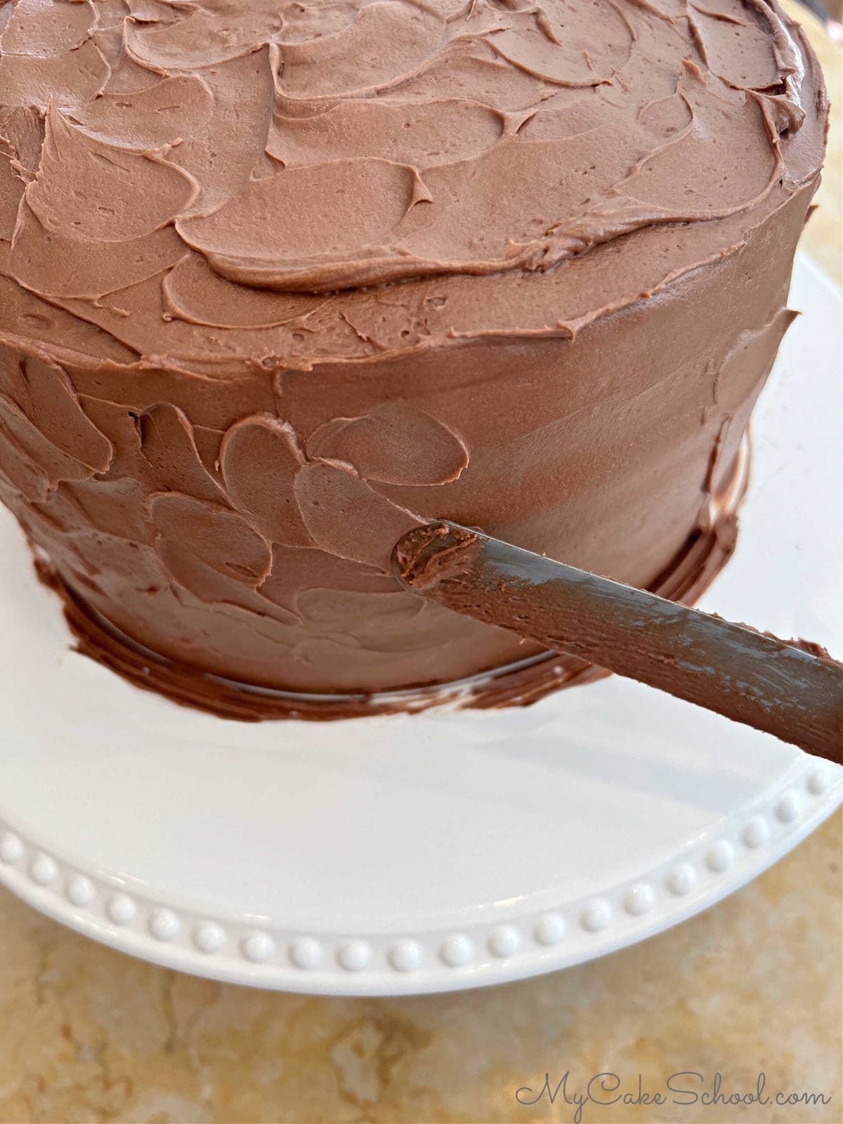 After chilling the crumb coated cake, we applied the second layer of chocolate buttercream and added texture with an offset spatula. Decorate however you like!
