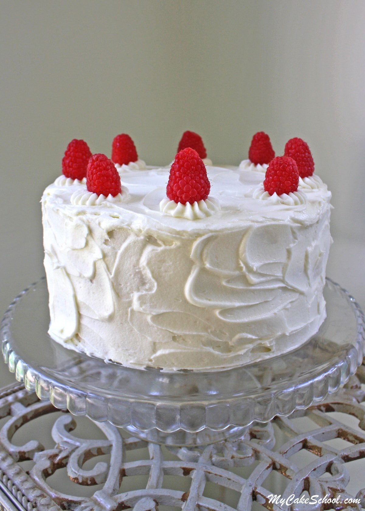 I also applied several stars with a french piping tip (Ateco 863), and garnished with fresh raspberries. The finished cake stands just under 4 inches.