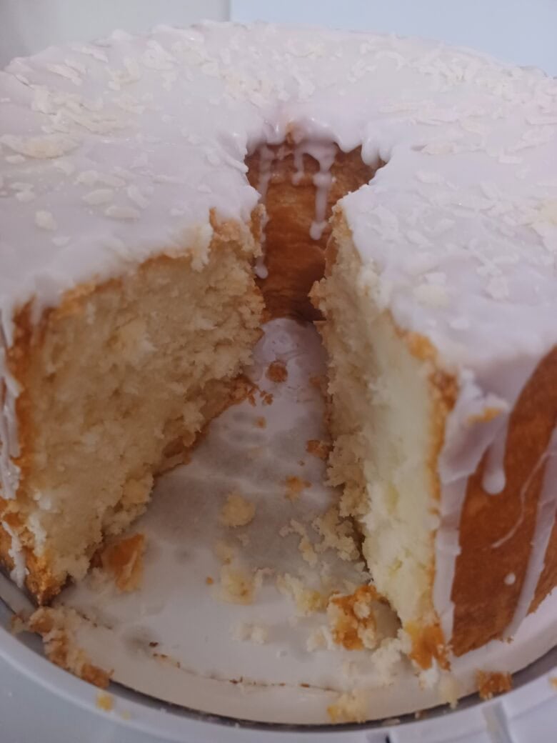 After cooling the cake, we drizzled a coconut glaze on top. This is a simple glaze of confectioners sugar, a bit of milk, pinch of salt, and coconut extract.
