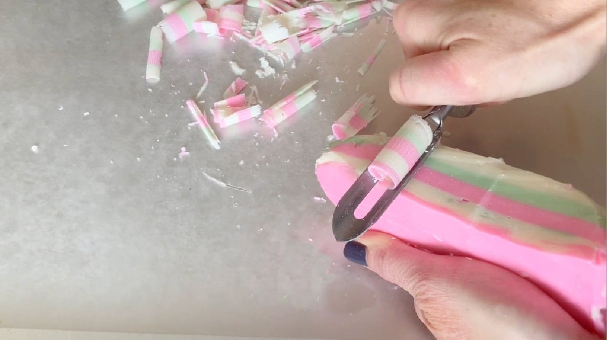 The layered look of the chocolate block is what gives us our fun and whimsical striped curls! I like this method even if I were making solid shades of curls--the block of candy coating was really easy to work with.