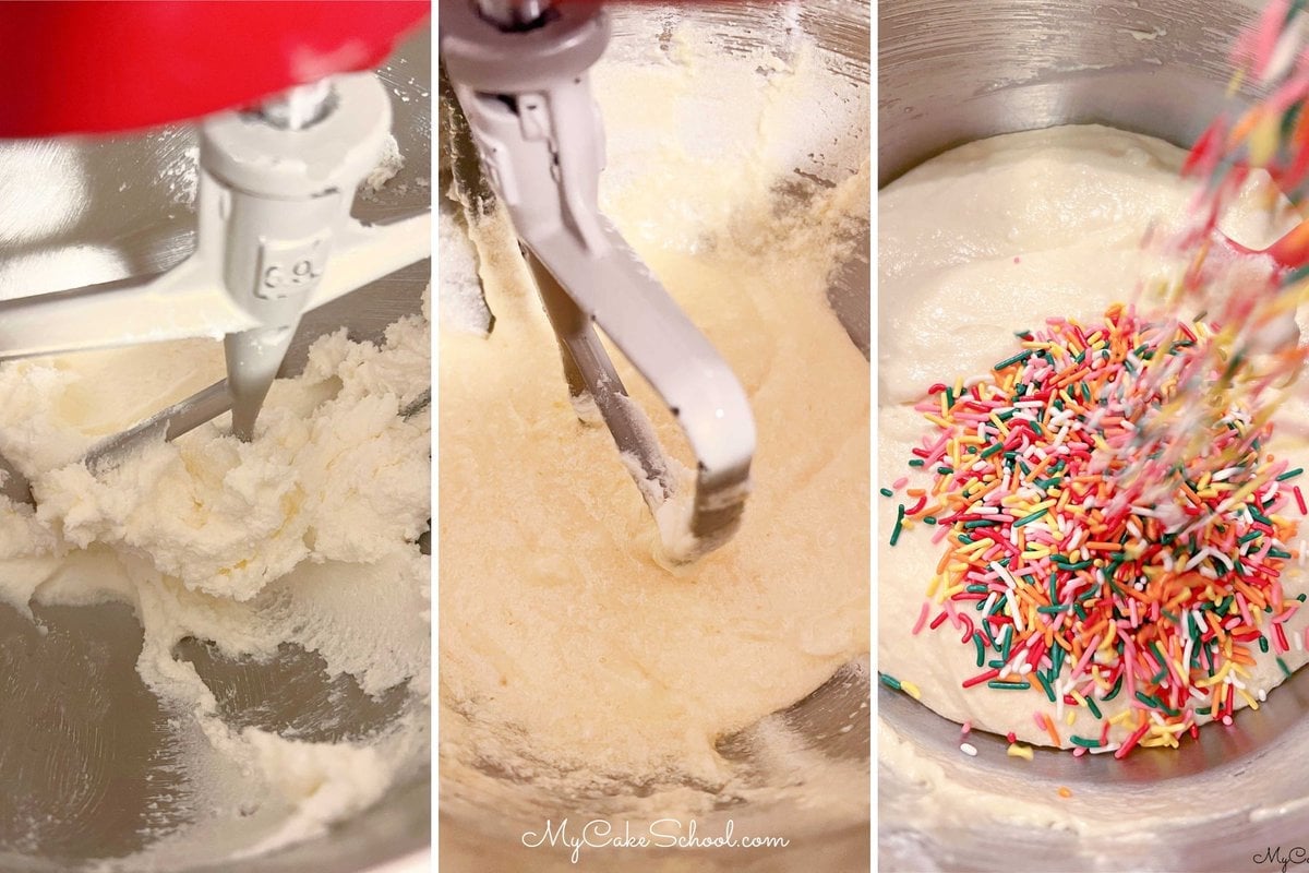 This Funfetti Cupcake recipe is based in part on our scratch Yellow Cake recipe. You can find the full, printable funfetti cupcake recipe at the bottom of this post. Here is a quick rundown of our steps!