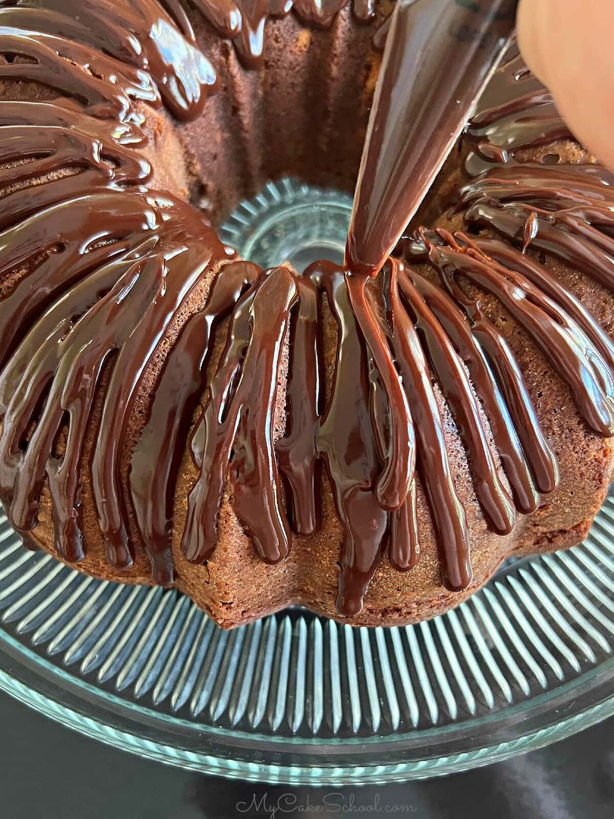 The ganache will thicken as it cools. Cool to desired consistency for drizzling over the cake. (If it is too hot, it will run all the way down to your cake plate or pedestal.)
