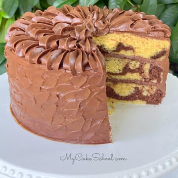 Our Chocolate Buttercream Recipe is creamy, super easy to make, and pipes beautifully. We are using it as both a filling and frosting for this marble cake mix recipe!