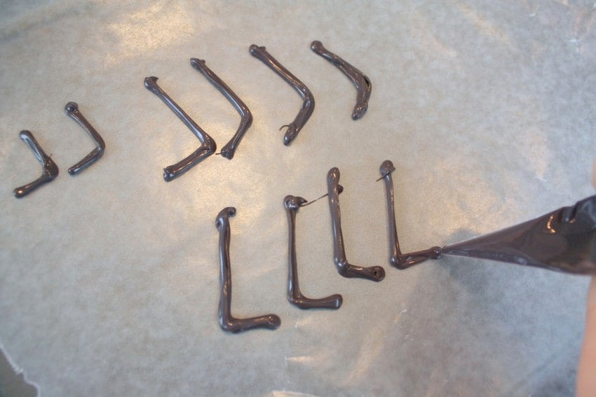 To make our legs, I melted a handful of black Wilton candy melts in the microwave. Then, I piped "L" shaped legs onto a waxed paper lined cookie sheet. You want them to be long enough to anchor into the cake. Also, make them fairly thick so that they won't be fragile. After piping, I popped them in the freezer for about 5-10 minutes so that they would be firm when I placed them into the cakes.