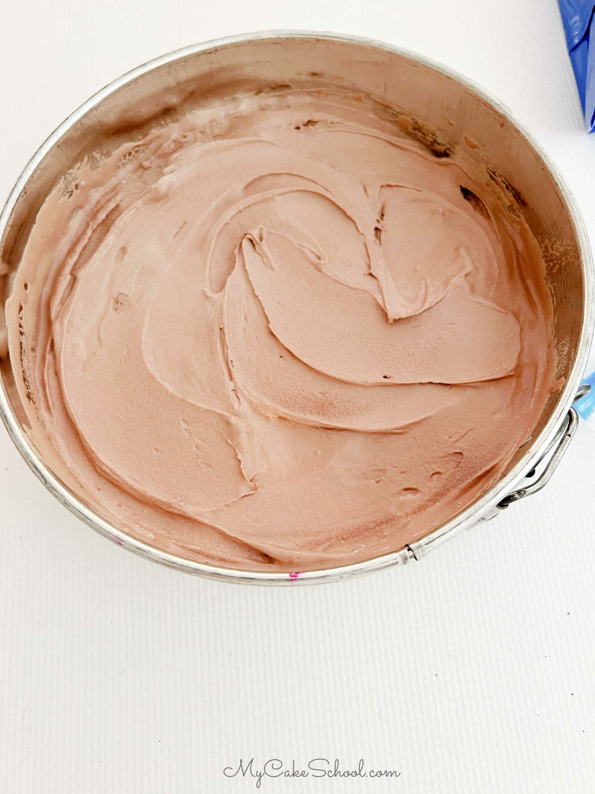 - Spread softened chocolate ice cream over the crushed Oreos. Spreading with a hot metal spoon makes it even easier to spread.