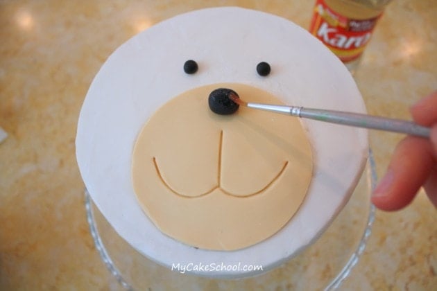 I added small little black fondant eyes and a nose. You can improvise with buttercream, candy pieces, etc. if you'd rather not use fondant. I brushed the nose with a little stroke of light corn syrup for shine.