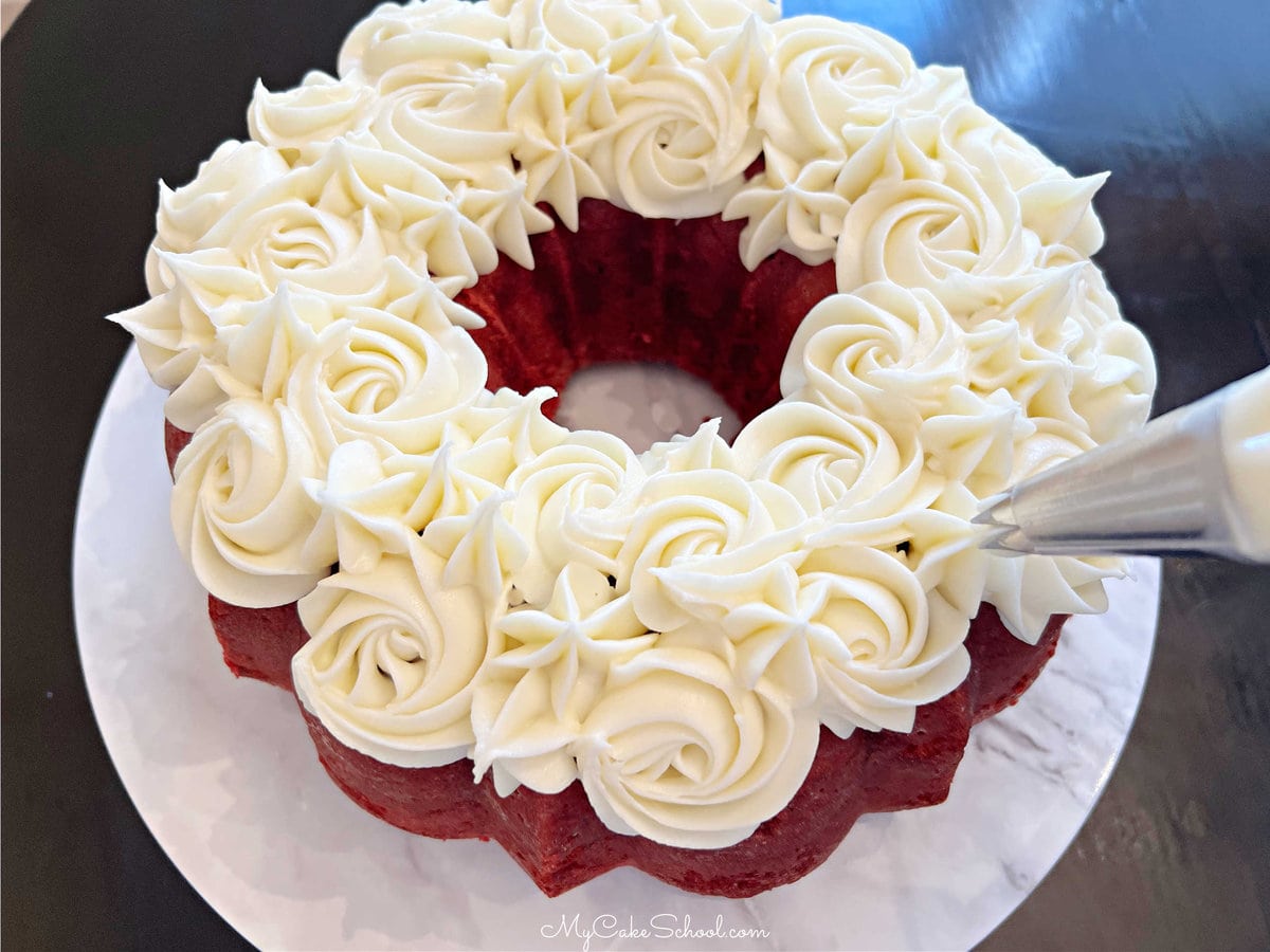 - Decorating the CakeWe used our large star tip (1M) to pipe rosettes and stars over the top of the cake with the cream cheese frosting. If it is too soft, chill in the refrigerator for a few minutes. You can also spread the frosting on top of the cake with an offset spatula. (This is a half batch of our cream cheese frosting recipe).