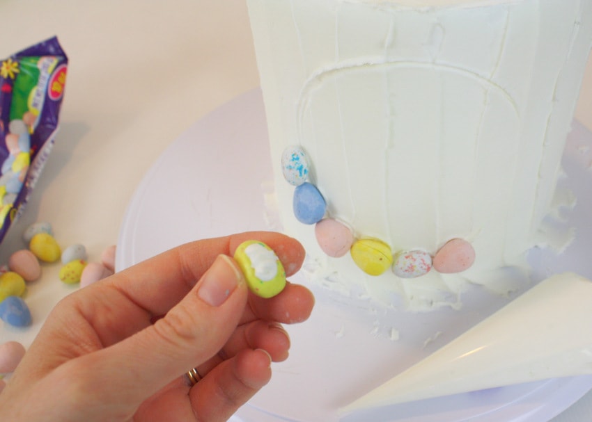By the time I had picked out the colors that I wanted for my wreath,my crusting buttercream had crusted over. So, I filled a piping bag with more buttercream, snipped the end, and piped buttercream onto the back of each egg.